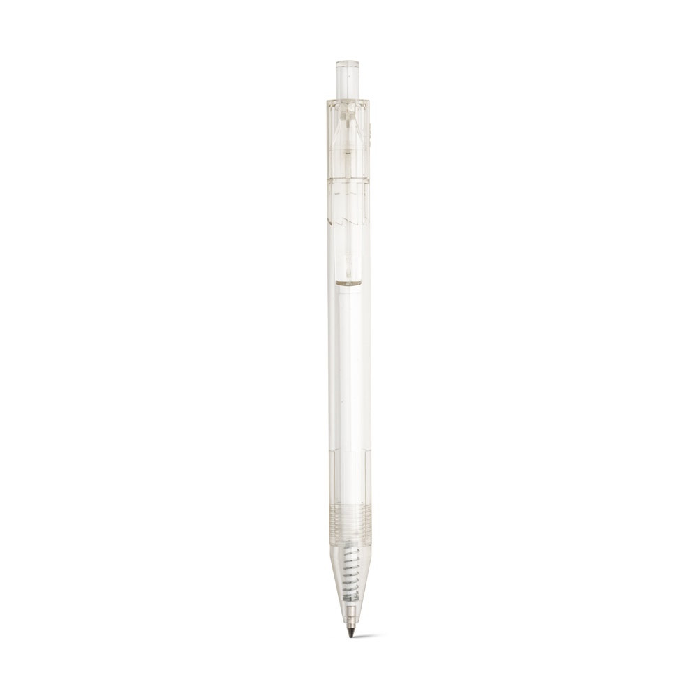 Golyóstoll átlátszó újrahasznosított PET anyagból, színes gombbal. Fekete tinta. ø11 x 142 mm