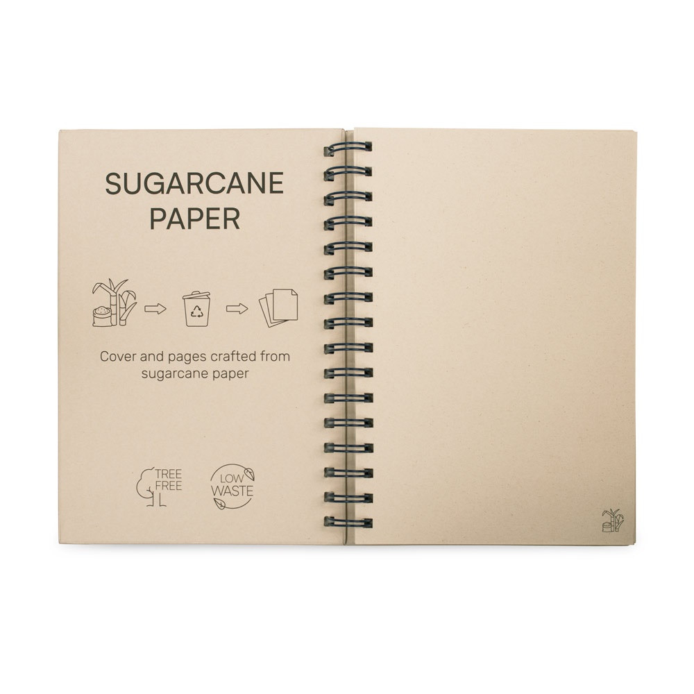 A5-ös jegyzetfüzet gyűrűkkel, kemény borítóval, cukornádpapírból (80% cukornádpép). 160 sima, 90 g/m²-es lapot tartalmaz cukornádpapírból (80% cukornádpép), valamint gumit a füzet lezárásához