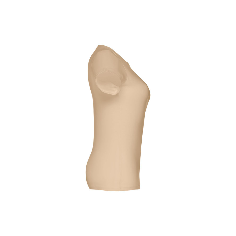 100% pamut jersey, karcsúsított női póló (190 g/m²), kártolt, puha tapintású fonalból szőve. (A 183-as szín esetében az anyagösszetétel eltérő: 90% pamut/10% viszkóz.) Vékony jersey nyak, szatén megerősítéssel. Dupla öltés az ujjakon és az alján. Szabott-varrott