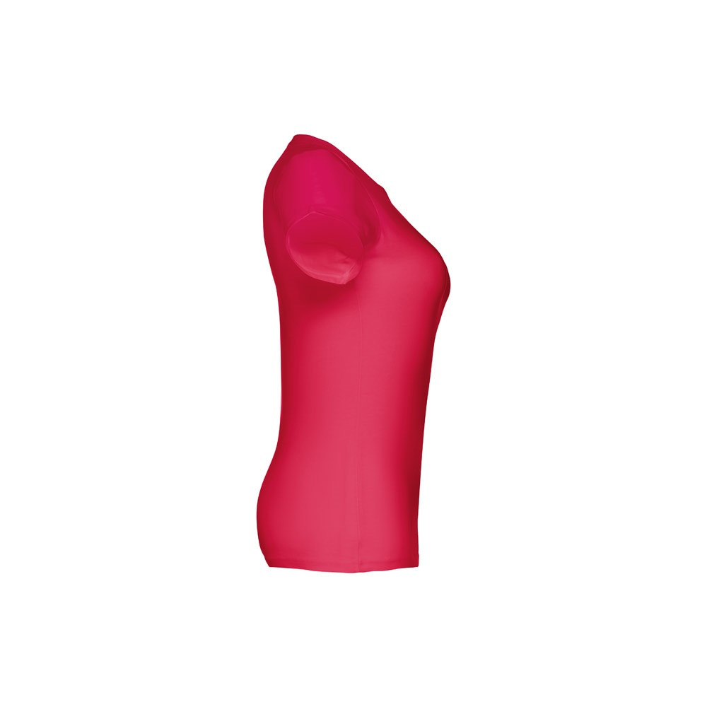 100% pamut jersey, karcsúsított női póló (190 g/m²), kártolt, puha tapintású fonalból szőve. (A 183-as szín esetében az anyagösszetétel eltérő: 90% pamut/10% viszkóz.) Vékony jersey nyak, szatén megerősítéssel. Dupla öltés az ujjakon és az alján. Szabott-varrott