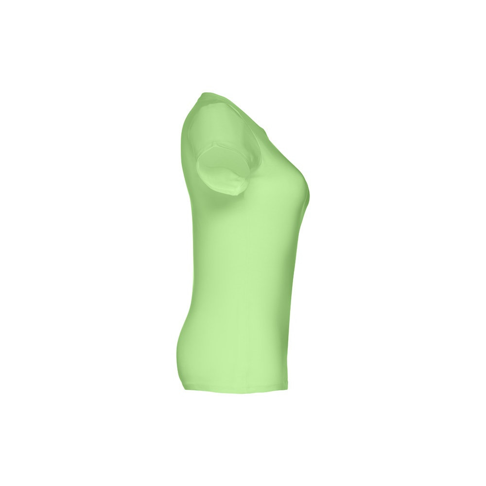 100% pamut jersey, karcsúsított női póló (190 g/m²), kártolt, puha tapintású fonalból szőve. (A 183-as szín esetében az anyagösszetétel eltérő: 90% pamut/10% viszkóz.) Vékony jersey nyak, szatén megerősítéssel. Dupla öltés az ujjakon és az alján. Szabott-varrott. Méretek: S, M, L, XL, XXL