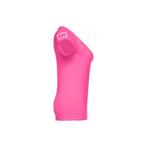 100% pamut jersey karcsúsított női póló (150 g/m²),kártolt, puha tapintású fonalból szőve. (Az anyagösszetétel a 194, 195 és 199-es színeknél eltérő lehet: 60% pamut/40% poliészter). Jersey nyak, belül jersey szalaggal megerősített, átfedett V-nyakkivágással. Dupla öltés az ujjakon és az alján. Szabott-varrott. Méretek: S, M, L, XL, XXL