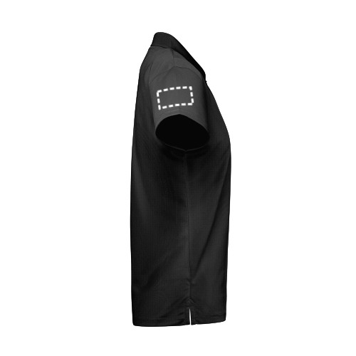 Női rövid ujjú póló, 100% újrahasznosított poliészter pique kötött anyagból (180 g/m²). 1x1 bordás gallérral és dupla varrással rendelkezik az ujjakon és az alsó részen. 3 darab megerősített, fehér színnel bevont gombból álló gombsor (kivéve a 106-os színt, amely esetén a gombsor fekete színű a kontraszt érdekében). A póló alján kis oldalsó nyílásokkal rendelkező varrt rész található, fehér színben (kivéve a 106-os színt, amely esetén a rész fekete színű a kontraszt érdekében)