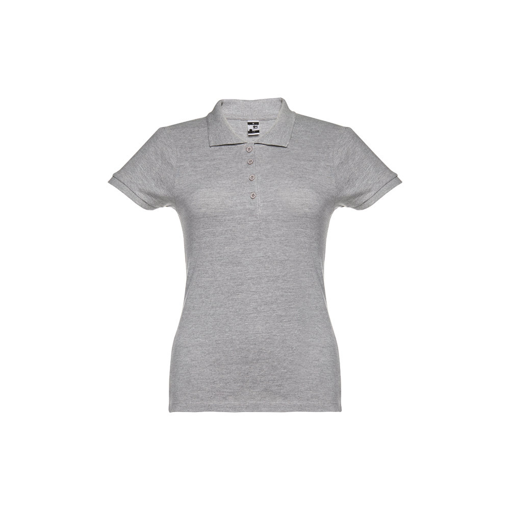 100% kártolt, puha tapintású pamut piqué, rövid ujjú női póló (195 g/m²). (A 183-as szín esetében az anyagösszetétel eltérő: 85% pamut/15% viszkóz.) Piqué szalaggal megerősített, bordázott gallérral és bordázott ujj szegélyekkel. Gombolópánt a nyakon, 4 a póló színével megegyező színű gombbal. (Pótgomb a belső varraton.) Szabott-varrott. Méretek: S, M, L, XL, XXL