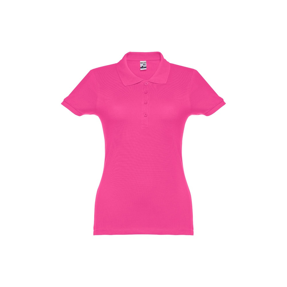 100% kártolt, puha tapintású pamut piqué, rövid ujjú női póló (195 g/m²). (A 183-as szín esetében az anyagösszetétel eltérő: 85% pamut/15% viszkóz.) Piqué szalaggal megerősített, bordázott gallérral és bordázott ujj szegélyekkel. Gombolópánt a nyakon, 4 a póló színével megegyező színű gombbal. (Pótgomb a belső varraton.) Szabott-varrott