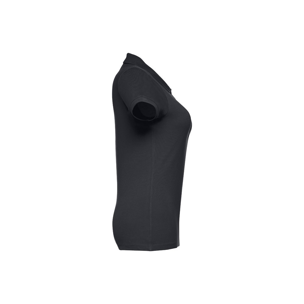100% kártolt, puha tapintású pamut piqué, rövid ujjú női póló (195 g/m²). (A 183-as szín esetében az anyagösszetétel eltérő: 85% pamut/15% viszkóz.) Piqué szalaggal megerősített, bordázott gallérral és bordázott ujj szegélyekkel. Gombolópánt a nyakon, 4 a póló színével megegyező színű gombbal. (Pótgomb a belső varraton.) Szabott-varrott