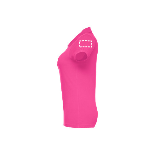 100% kártolt, puha tapintású pamut piqué, rövid ujjú női póló (195 g/m²). (A 183-as szín esetében az anyagösszetétel eltérő: 85% pamut/15% viszkóz.) Piqué szalaggal megerősített, bordázott gallérral és bordázott ujj szegélyekkel. Gombolópánt a nyakon, 4 a póló színével megegyező színű gombbal. (Pótgomb a belső varraton.) Szabott-varrott. Méretek: S, M, L, XL, XXL