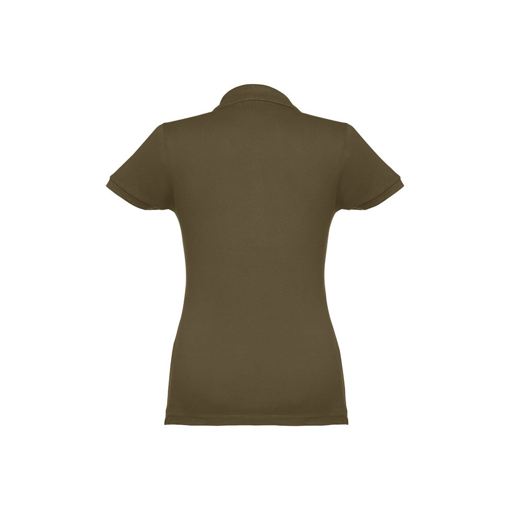 100% kártolt, puha tapintású pamut piqué, rövid ujjú női póló (195 g/m²). (A 183-as szín esetében az anyagösszetétel eltérő: 85% pamut/15% viszkóz.) Piqué szalaggal megerősített, bordázott gallérral és bordázott ujj szegélyekkel. Gombolópánt a nyakon, 4 a póló színével megegyező színű gombbal. (Pótgomb a belső varraton.) Szabott-varrott