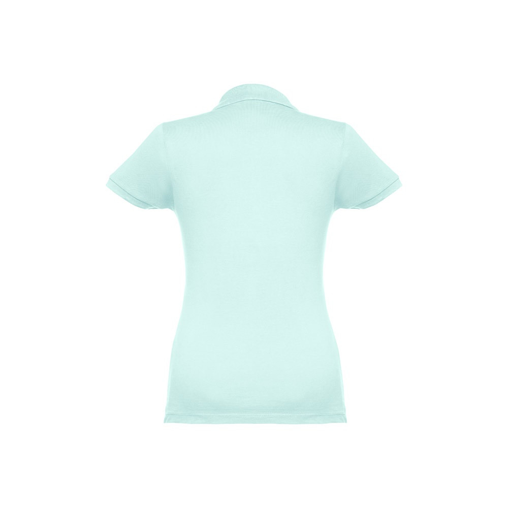 100% kártolt, puha tapintású pamut piqué, rövid ujjú női póló (195 g/m²). (A 183-as szín esetében az anyagösszetétel eltérő: 85% pamut/15% viszkóz.) Piqué szalaggal megerősített, bordázott gallérral és bordázott ujj szegélyekkel. Gombolópánt a nyakon, 4 a póló színével megegyező színű gombbal. (Pótgomb a belső varraton.) Szabott-varrott