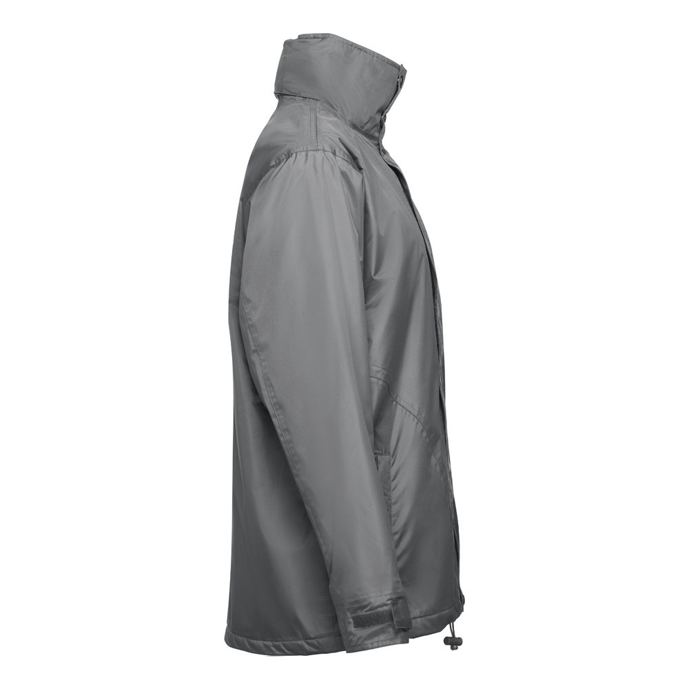 Bélelt unisex kabát 100% poliészterből (külseje: 240 g/m² 100% poliészter selyem 240, vízálló PVC borítással, belseje: 65 g/m² 100% poliészter taft, bélés: 100% poliészter 80 g/m²). A gallér fekete polár hálóval bélelt (tépőzárral). Összehajtható kapucni a galléron, fekete megállítókkal. Tépőzáras cipzárfedő, fekete gumírozott patentokkal a nyakon és az anyag színével egyező cipzár. 2 külső zseb fedéllel és 2 belső zseb (1 mobiltelefonhoz) tépőzárral. 2x2 bordás belső mandzsetta és tépőzárral állítható külső mandzsetta. Hőhegesztett varratok. Hátul az alján cipzáras hozzáférés a testreszabható felülethez