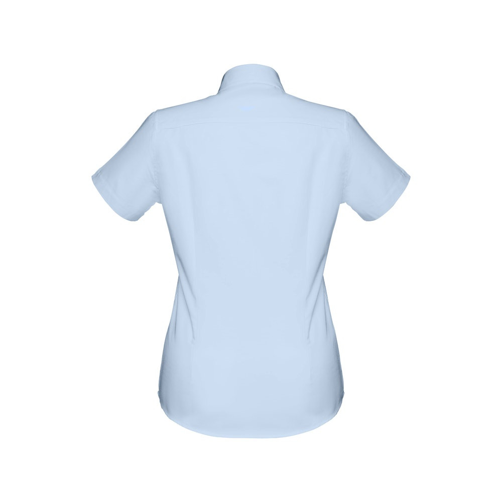 Rövid ujjú női oxford ing 70% pamutból és 30% poliészterből (130 g/m²). Karcsúsított fazon, elől és hátul 2-2 varrással és dupla öltéssel az ujjszegélyeken. 7 gyöngy színű gomb a gombolópánton