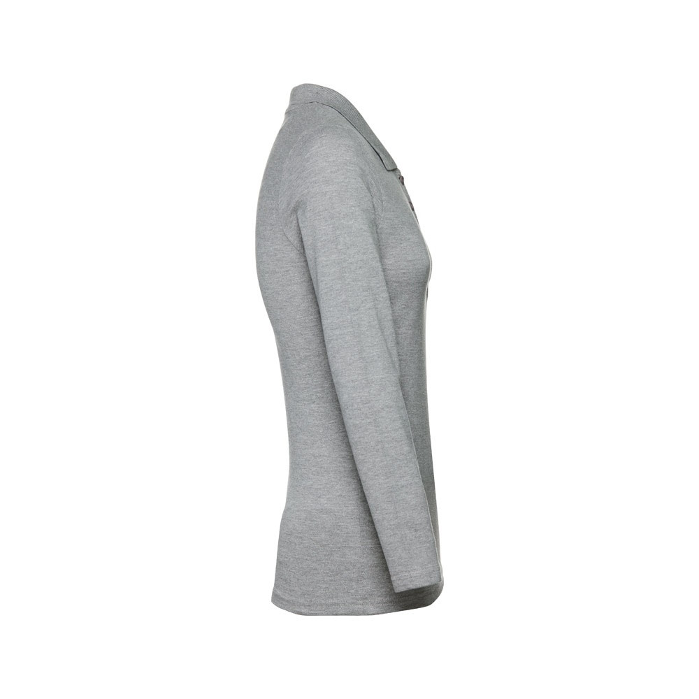 100% kártolt, puha tapintású pamut piqué női póló (210 g/m²). Normál szabású, hosszú ujjú póló, bordázott ujj szegélyekkel és gallérral. (A 183-as szín esetében az anyagösszetétel eltérő: 85% pamut/15% viszkóz.) Kötött piqué szallaggal megerősített gallér. Gombolópánt elől a nyakrésznél, három, a poló anyagával megeggyező színű gombbal (extra gombbal a belső varraton). Szabott-varrott, az ujjakon dupla varrással. Eltávolítható címkével. Méretek: S, M, L, XL, XXL