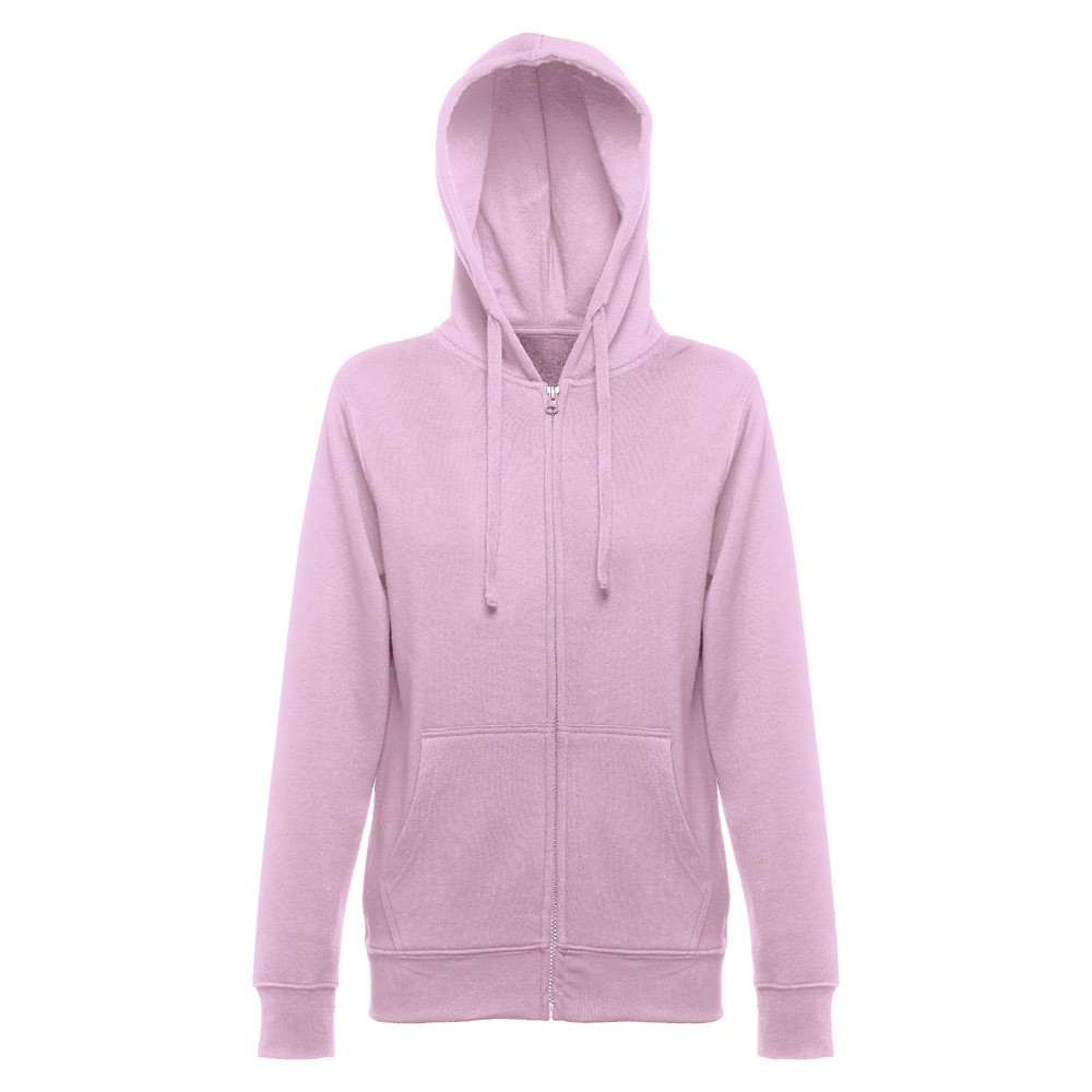 Női cipzáras, kapucnis pulóver 50% pamutból és 50% poliészterből (320g/m²). Húzózsinóros, bélelt kapucni. Kártolt, puha tapintású belsőrész. Elől két erszényes zseb és műanyag, rejtett cipzár. Az ujjak madzsettákkal az alján pedig övpánttal. Méretek: S, M, L, XL, XXL