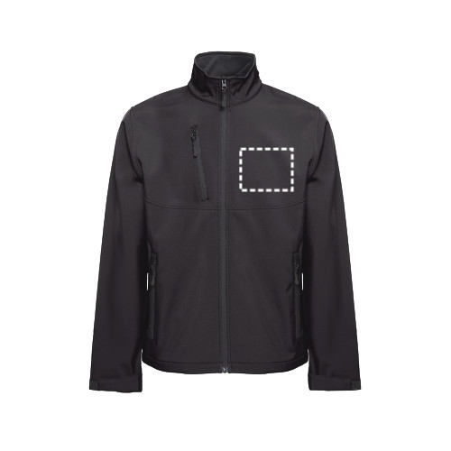 96% poliészter és 4% elasztán (280 g/m²) softshell unisex kabát két rétegű, vízálló bevonattal. Polár bélésű kabát, két cipzáras, gumírozott cipzárhúzós, átlós elülső zsebbel. Tépőzáras pánttal állítható mandzsettával és a derekán húzózsinóral
