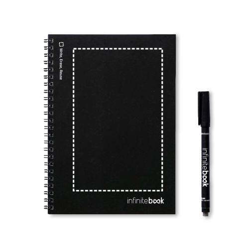 A5 méretű jegyzetfüzet - „Infinitebook” - rugalmas borítóval és hozzá illő színű gyűrűkkel. Tartalmaz 15 fehér tábla stílusú sima lapot és egy fekete filctollat. Ez a jegyzettömb könnyű írást és törlést tesz lehetővé, és praktikus megoldás a papírfogyasztás minimalizálására. A jegyzetek beolvashatók. Európában készült. Kraftpapír borítékban, matricával ellátva szállítjuk