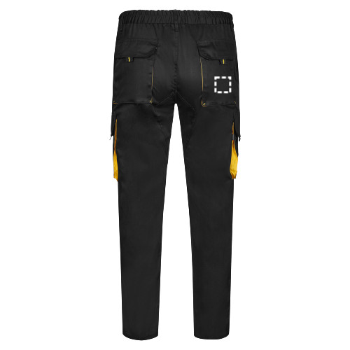 Kétszínű, többzsebes szövetnadrág (200g/m²), pamutból (35%) és poliészterből (65%). Elasztikus derékszíjjal, kontrasztos színnel a bújtatókon, a húzókákon és a varráson. Hat zsebet tartalmaz: (2 francia zseb, 2 oldalzseb és 2 hátsó zseb)