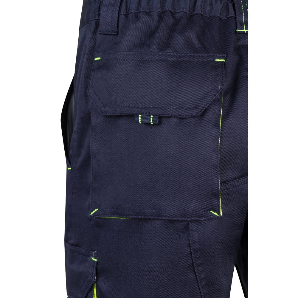 Kétszínű, többzsebes, sztreccs bermuda rövidnadrág (240g/m²), pamutból (46%), EME-ből (38%) és poliészterből (16%). Elasztikus derékszíjjal, kontrasztos színnel a bújtatókon, a húzókákon és a varráson, valamint szöveterősítéssel a hátsó részen. Hat zsebet tartalmaz (2 francia zseb, 2 oldalzseb és 2 hátsó zseb). Méret: 34, 36, 38, 40, 42, 44, 46, 48, 50, 52, 54, 56, 58, 60