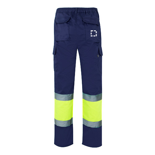Kétszínű szövet nadrág (210g/m²), bélelt, többzsebes, pamutból (20%) és poliészterből (80%). Elasztikus derékpánttal, fényvisszaverő csíkokkal a nadrág alján. Hat zsebet tartalmaz (2 francia zseb, 2 oldalsó zseb és 2 hátsó zseb). A termék megfelel az EU 2016/425 rendeletnek, EN20471 tanúsítvánnyal és 1 osztályozással rendelkezik. Méret: S, M, L, XL, 2XL, 3XL