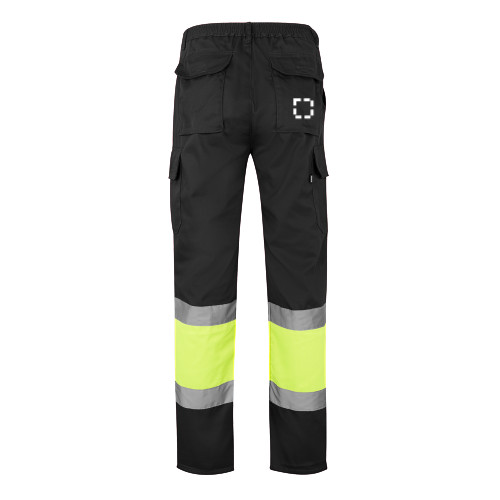 Kétszínű, többzsebes szövet nadrág (210g/m²), pamut (20%) és poliészter (80%) anyagból. Elasztikus derékpánttal és fényvisszaverő csíkokkal a nadrág alján. Hat zsebet tartalmaz (2 francia zseb, 2 oldalsó zseb és 2 hátsó zseb). A termék megfelel az EU 2016/425 rendeletnek, EN20471 tanúsítvánnyal és 1 osztályozással rendelkezik