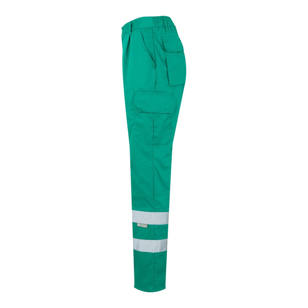 Többzsebes szövetnadrág (200g/m²), pamutból (35%) és poliészterből (65%). Elasztikus derékpánttal, fényvisszaverő csíkokkal a nadrág alján és hat zsebbel (2 francia zseb, 2 oldalzseb és 2 hátsó zseb). A termék megfelel az EU 2016/425 rendeletnek, EN17353 tanúsítvánnyal és B2 osztályozással rendelkezik. Méret: S, M, L, XL, 2XL, 3XL