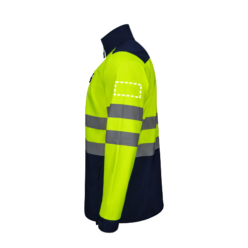 Kéttónusú soft shell kabát (280g/m²), poliészterből (96%) és elasztánból (4%). TPU bevonattal és gyapjú béléssel. Középen kontrasztos színű, fordított cipzárral, állítható ujjal és tépőzárral. Fényvisszaverő csíkok a törzsön és az ujjakon. Öt zsebet tartalmaz: 3 cipzáras zsebet és 2 belső zsebet. A termék megfelel az EU 2016/425 rendeletnek, EN20471 tanúsítvánnyal és 2 osztályozással rendelkezik. Méret: S, M, L, XL, 2XL, 3XL