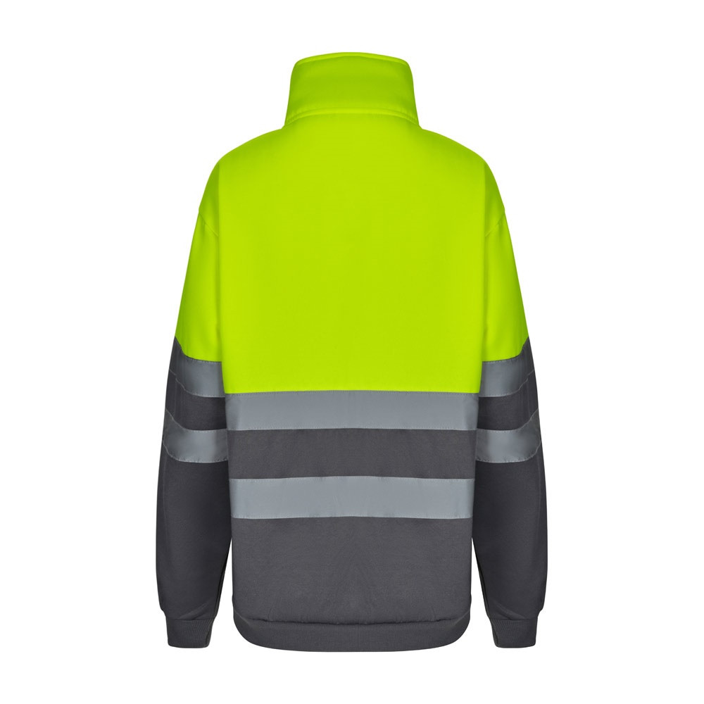 Kéttónusú pulóver (300g/m²) poliészter gyapjúból (100%). Magas gallérral és fél cipzárral. Bordázott ujjakkal és szegéllyel. Fényvisszaverő csíkok a törzsön és az ujjakon. A termék megfelel az EU 2016/425 rendeletnek, EN20471 tanúsítvánnyal és 1 osztályozással rendelkezik