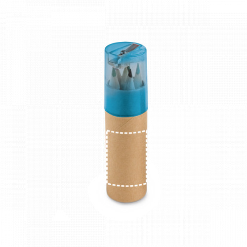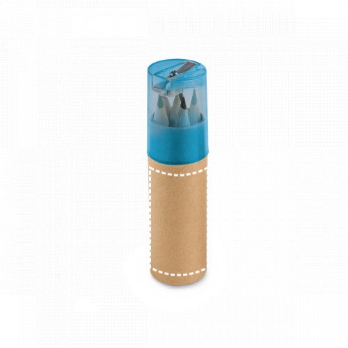 Karton és műanyag henger alakú doboz ceruzahegyezővel, 6 fa színes ceruzákkal