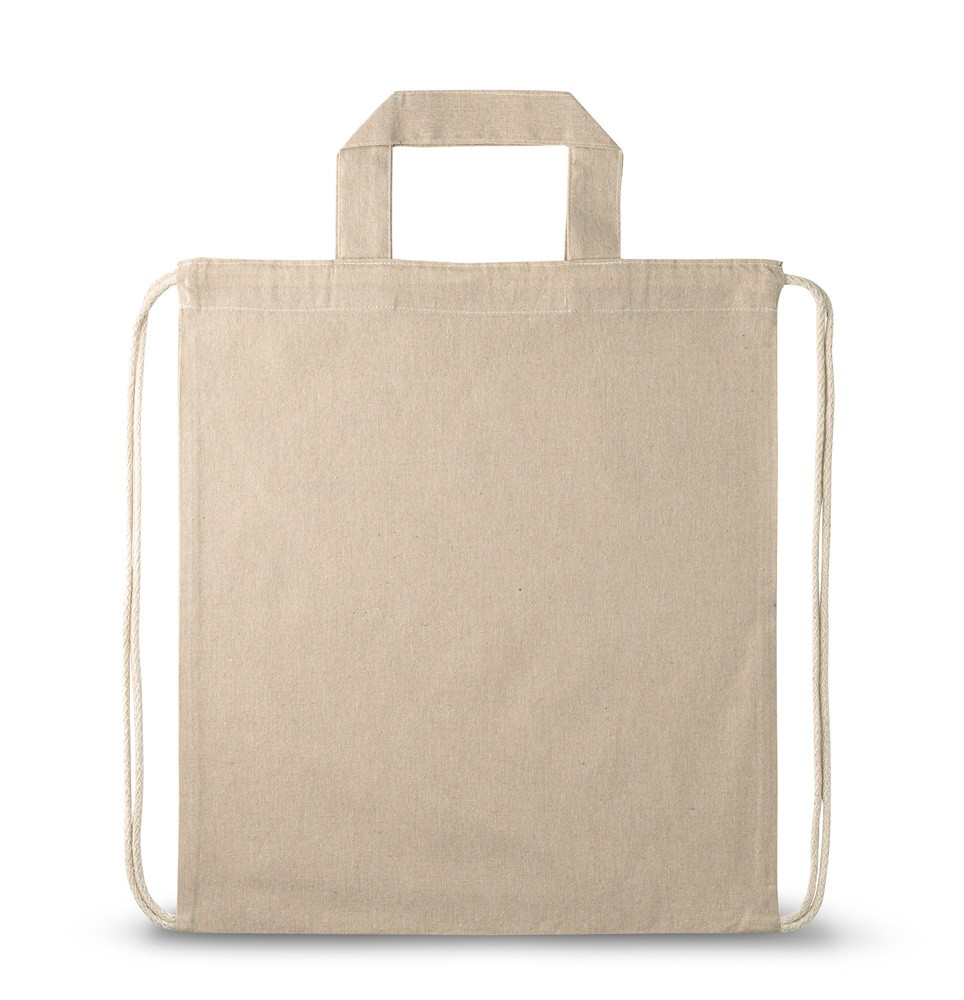 Tornazsák újrahasznosított pamuttal (70%) és poliészter (30% rPET) (140 g/m²), 30cm-es fogantyúkkal és pamut húzózsinórral a záráshoz. Az újrahasznosított pamut nem festett. A nyersanyagot eredeti formájában és színében használják fel, festő- vagy fehérítő vegyszerek használata nélkül, ami hozzájárul a kisebb környezeti hatáshoz