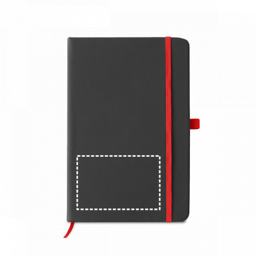 A5-ös jegyzetfüzet kemény, műbőr (PU) borítóval, 160 vonalas oldallal (70 g/m²), gumiszalaggal, könyvjelző szalaggal és tolltartóval (toll nem tartozik a csomaghoz). 140 x 210 mm