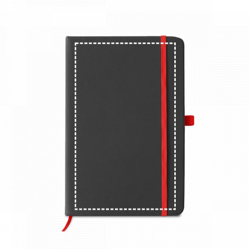 A5-ös jegyzetfüzet kemény, műbőr (PU) borítóval, 160 vonalas oldallal (70 g/m²), gumiszalaggal, könyvjelző szalaggal és tolltartóval (toll nem tartozik a csomaghoz). 140 x 210 mm