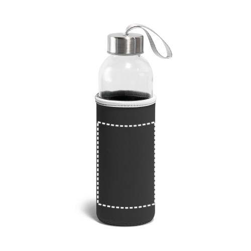 Üveg és rozsdamentes acél sportpalack kupakkal, soft shell tasakkal, és fogantyúval a könnyű szállítás érdekében. Kapacitása 520 mL. ø65 x 225 mm