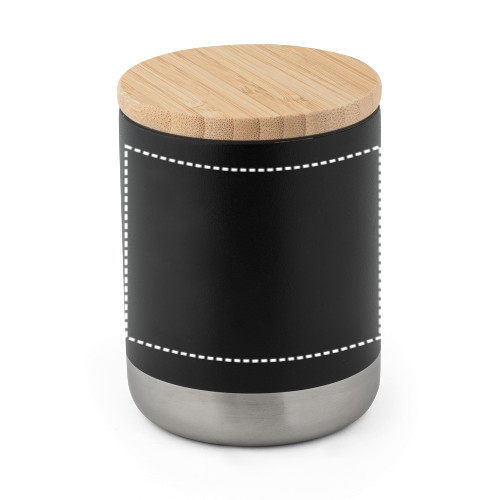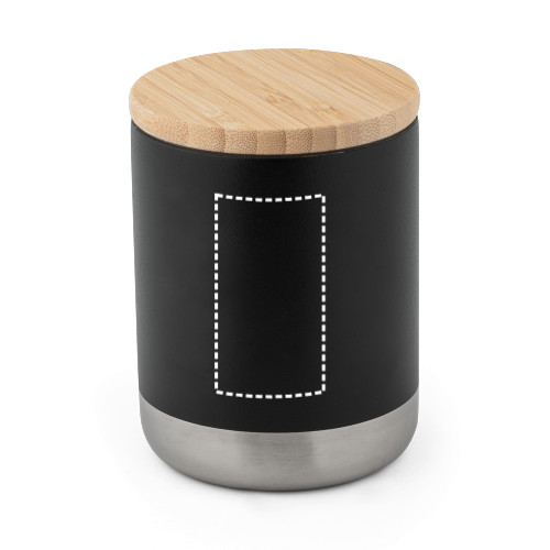 Duplafalú, rozsdamentes acél (36%-ban újrahasznosított), vákuumos csésze bambusz fedéllel és szilikongyűrűvel, a csöpögésmentesség érdekében. A csésze 370 mL -es. 5 órán keresztül képes tárolni a meleget, illetve 24 órán át hidegen tartja az italokat. Ezenkívül porbevonattal is rendelkezik, amely nagyobb tartósságot és szilárdságot biztosít. Kraftpapír díszdobozban szállítjuk. Mivel a termék természetes anyagokból készül, a termék színe, valamint a nyomtatás eredménye termékenként eltérő lehet. ø80 x 106 mm