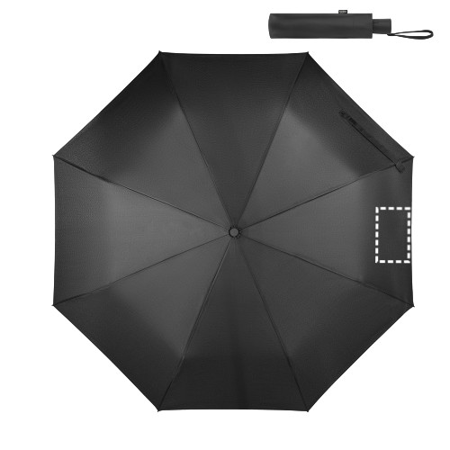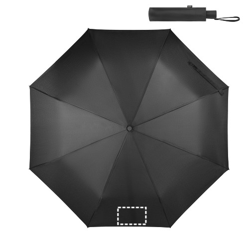Újrahasznosított poliészterből (100% rPET) 190T pongee esernyő, üvegszálas bordákkal és PP fogantyúval. Összecsukható esernyő 3 részből, automatikus nyitással és szélálló.Tasakban szállítjuk. Napernyő: ø990 x 290 mm | Táska: ø55 x 240 mm
